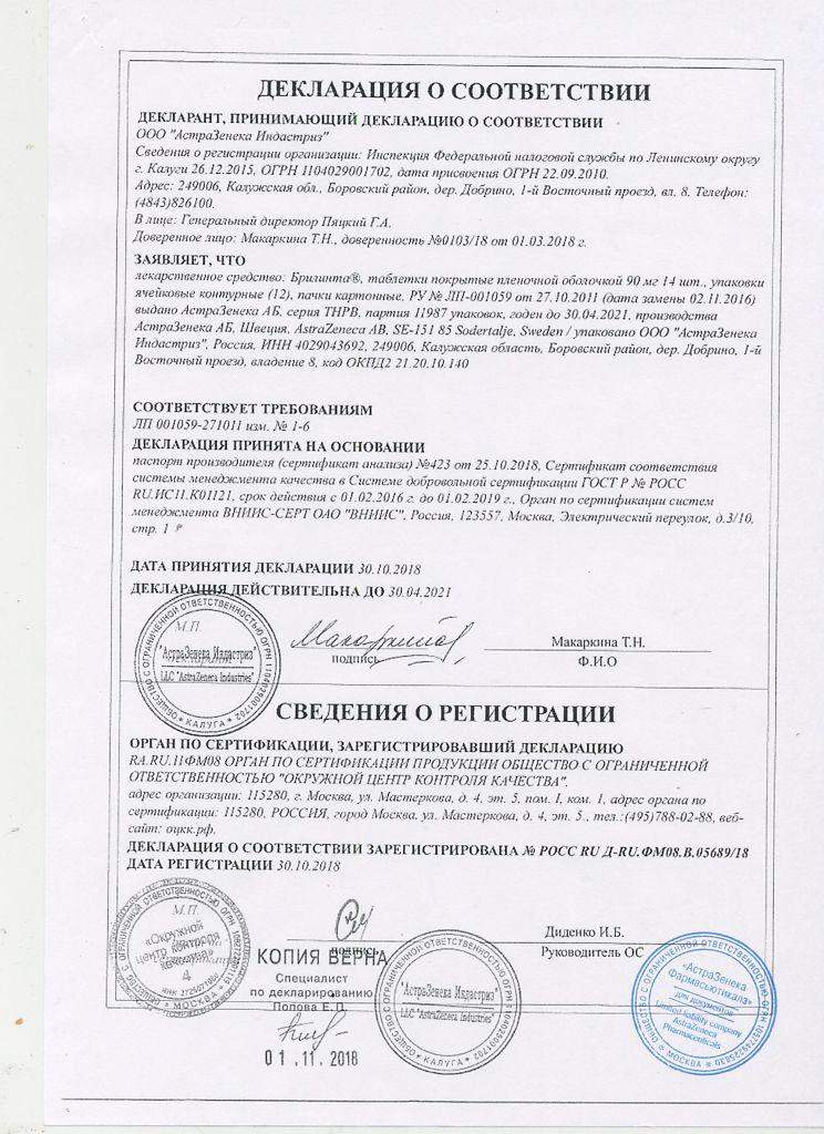 Инструкция по применению Брилинта табл. 90мг №56